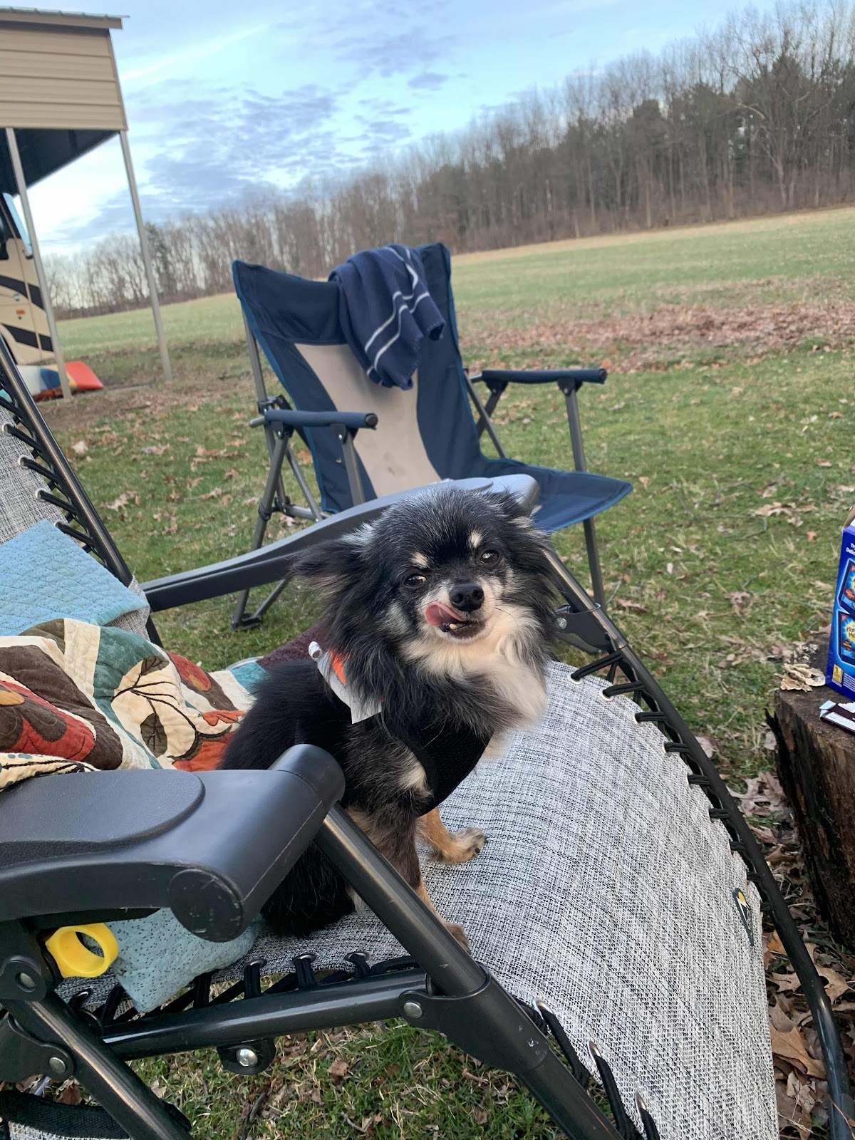 We have the motor home parked in her carport, but she’s facing the fire pit. As the days get nicer, we’re “camped out” there!