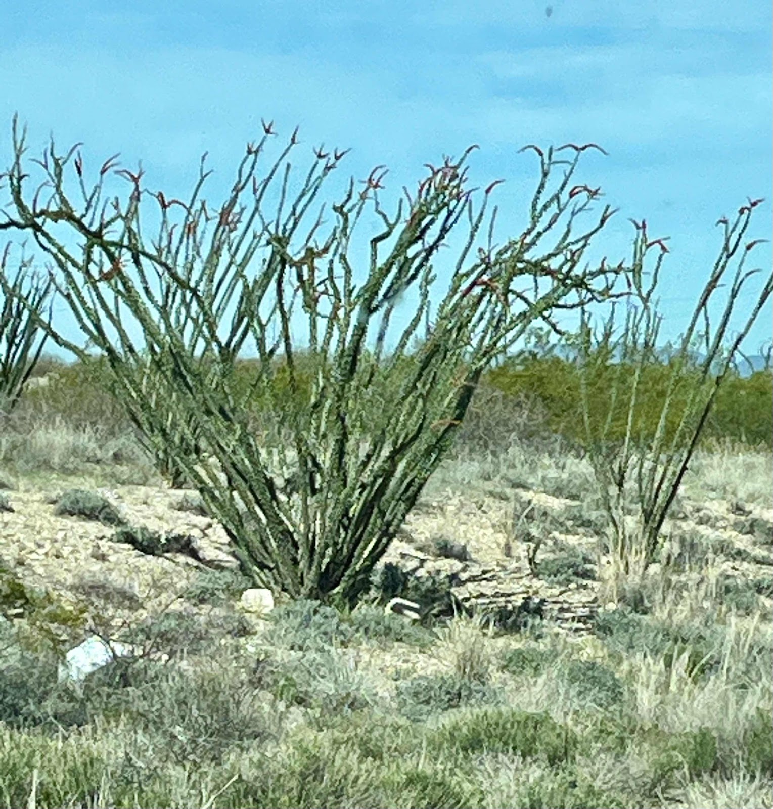 The ocotillo is beginning to bloom. Not too many saguaros around where we are.