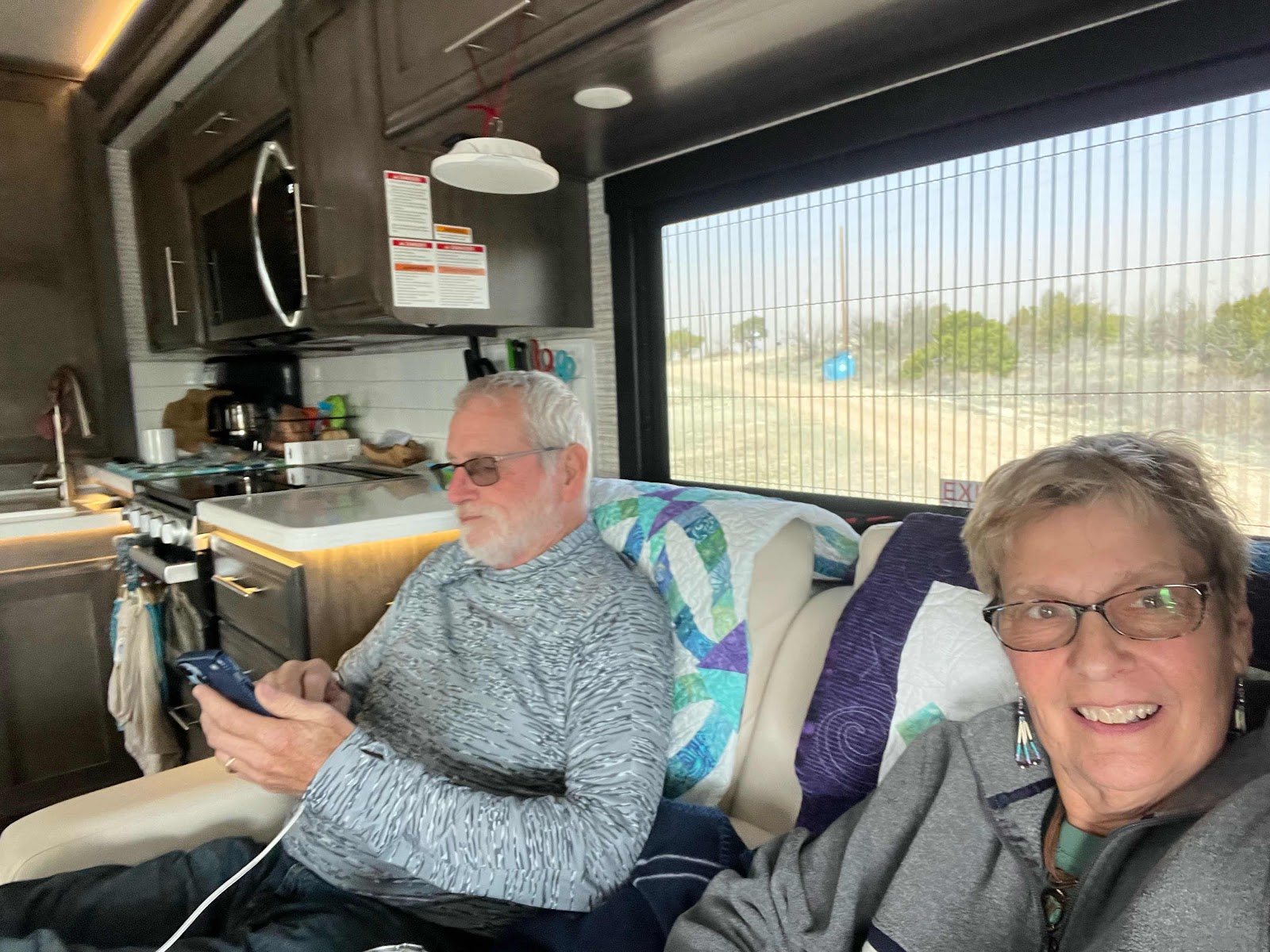 ALL 3 slides are in a the RV is still rocking. Winds are probably about 40-60 MPH. Electricity was turned off to prevent wildfires. It’s so dry here. Belle did a good job keeping us safe and warm, although I did have to put a hat on.